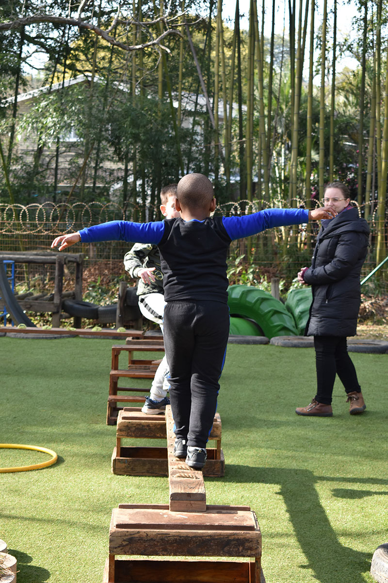 In Garden 1, the children have the opportunity to swing, climb and balance at various heights along a large variety of static apparatus and apparatus with moving parts. Over and above this, the ladders, beams and frames are set up every day in different formations, ensuring that the child is always being physically challenged and extended as they develop their core and large muscles, their coordination, confidence, vestibular and proprioceptive senses.